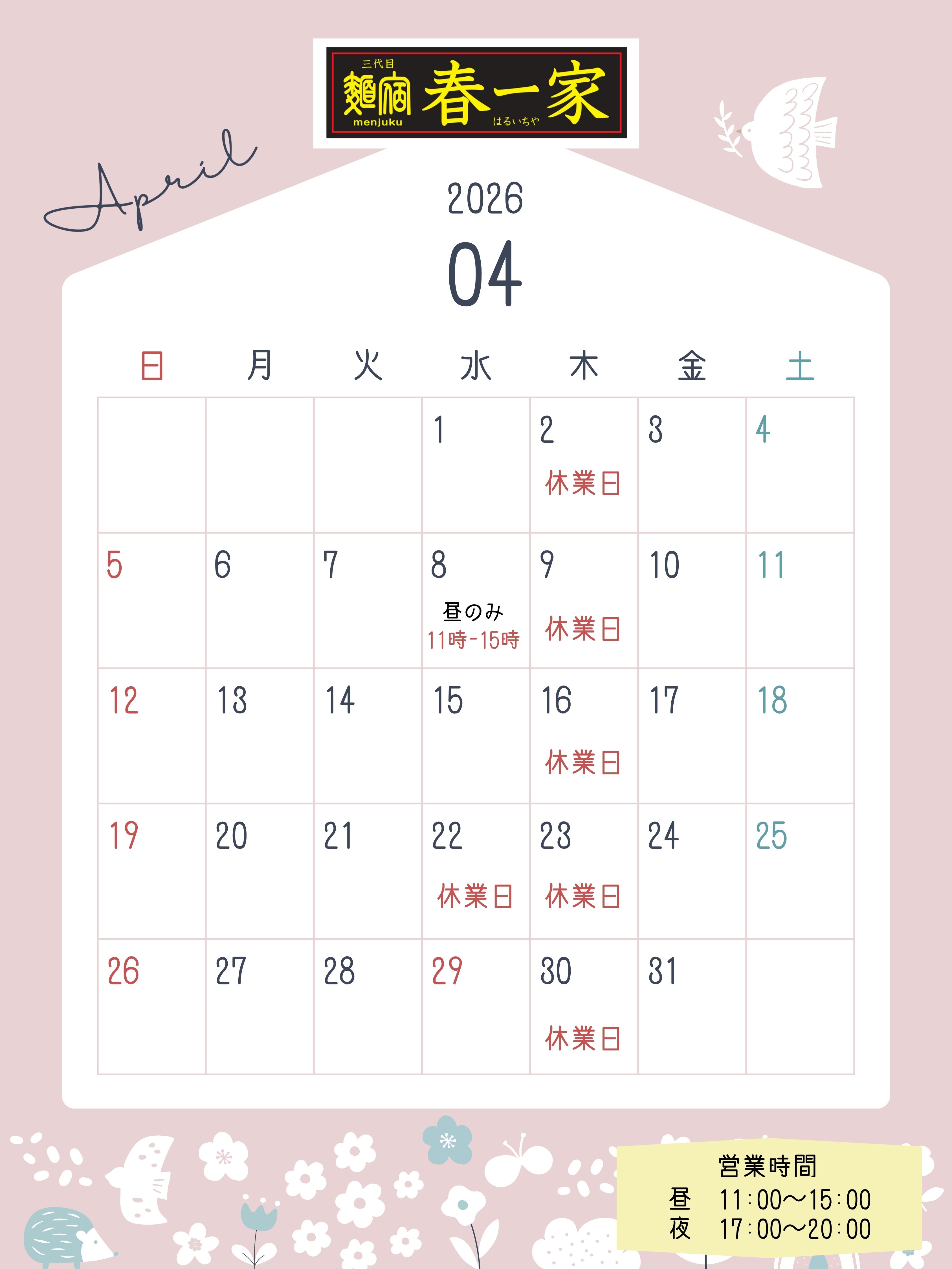 6日(水) 7日(木) 14日(木) 20日(水)昼のみ営業 21日(木) 28日(木) |